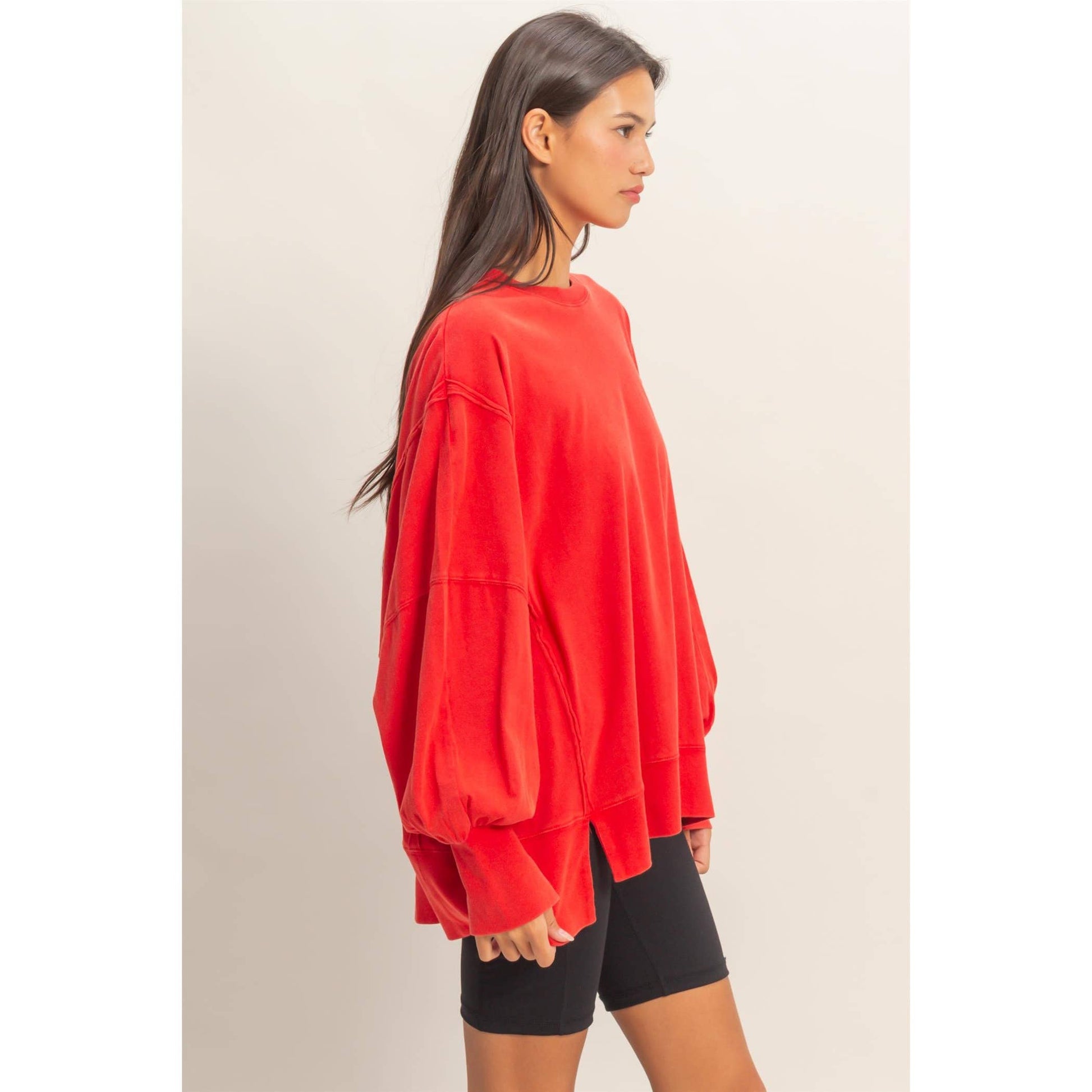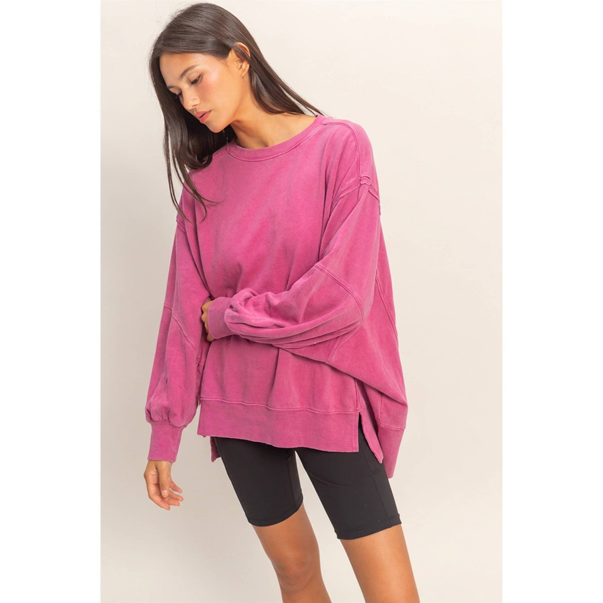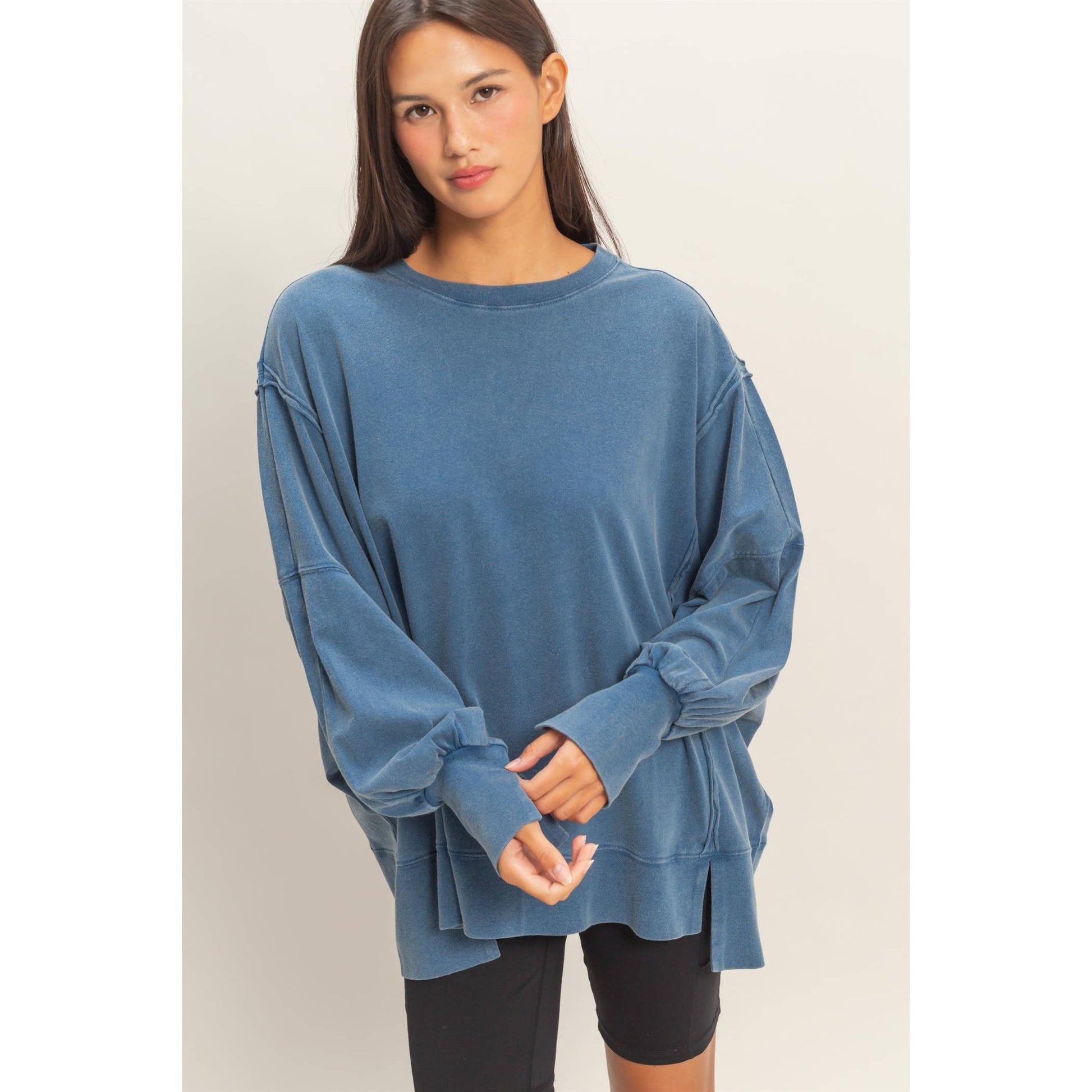This sweatshirt is crafted from soft cotton with a vintage wash finish. The design includes a classic crew neckline and long sleeves with exposed reverse seam detailing on the side panels. The cut is an oversized fit with side slits. Pair with leggings or distressed denim for a casual chic look. 100% Cotton Model Is 5' 7" Tall, 32" Chest, 23" Waist, 34" Hips And Wearing A Size Small Imported. Designed In The USA