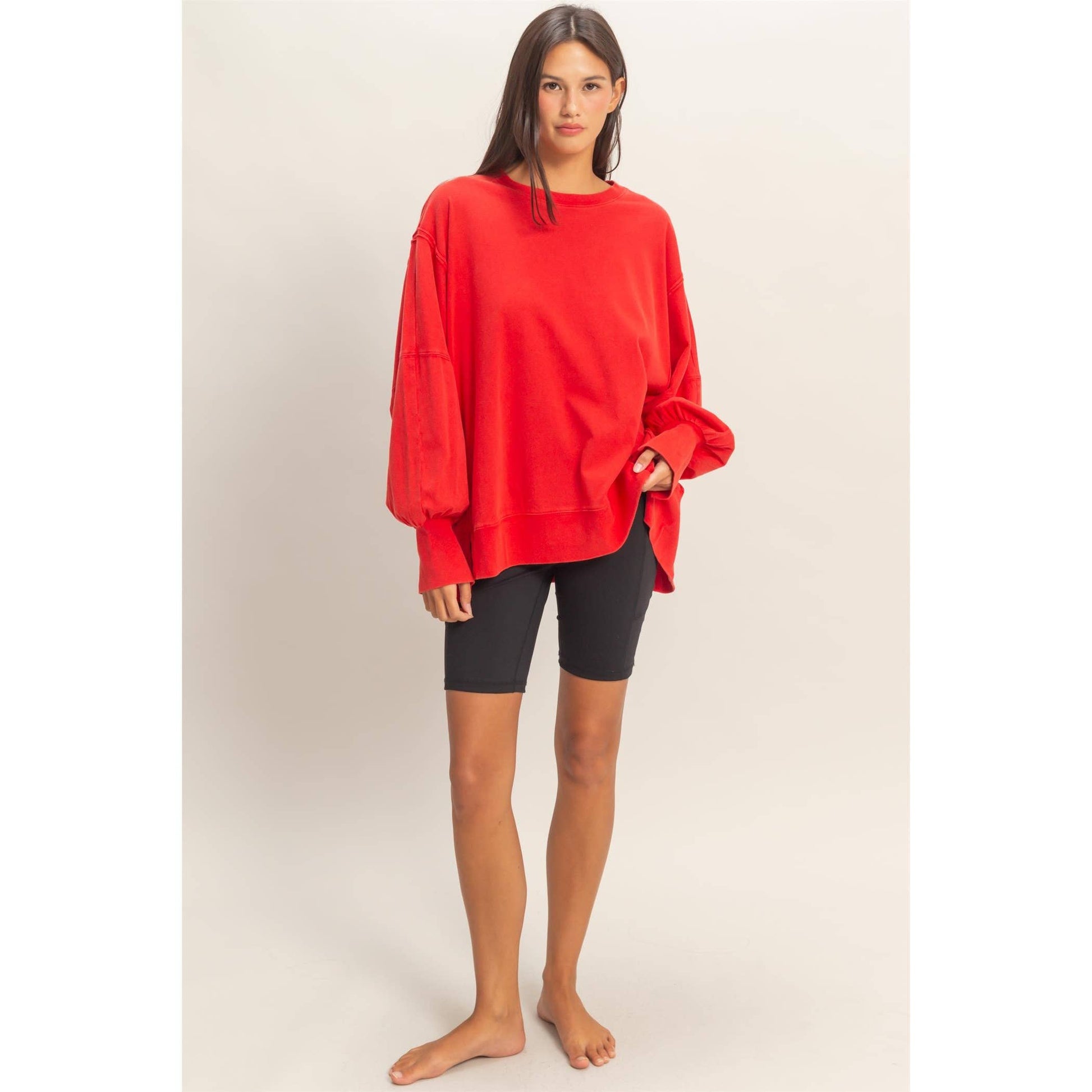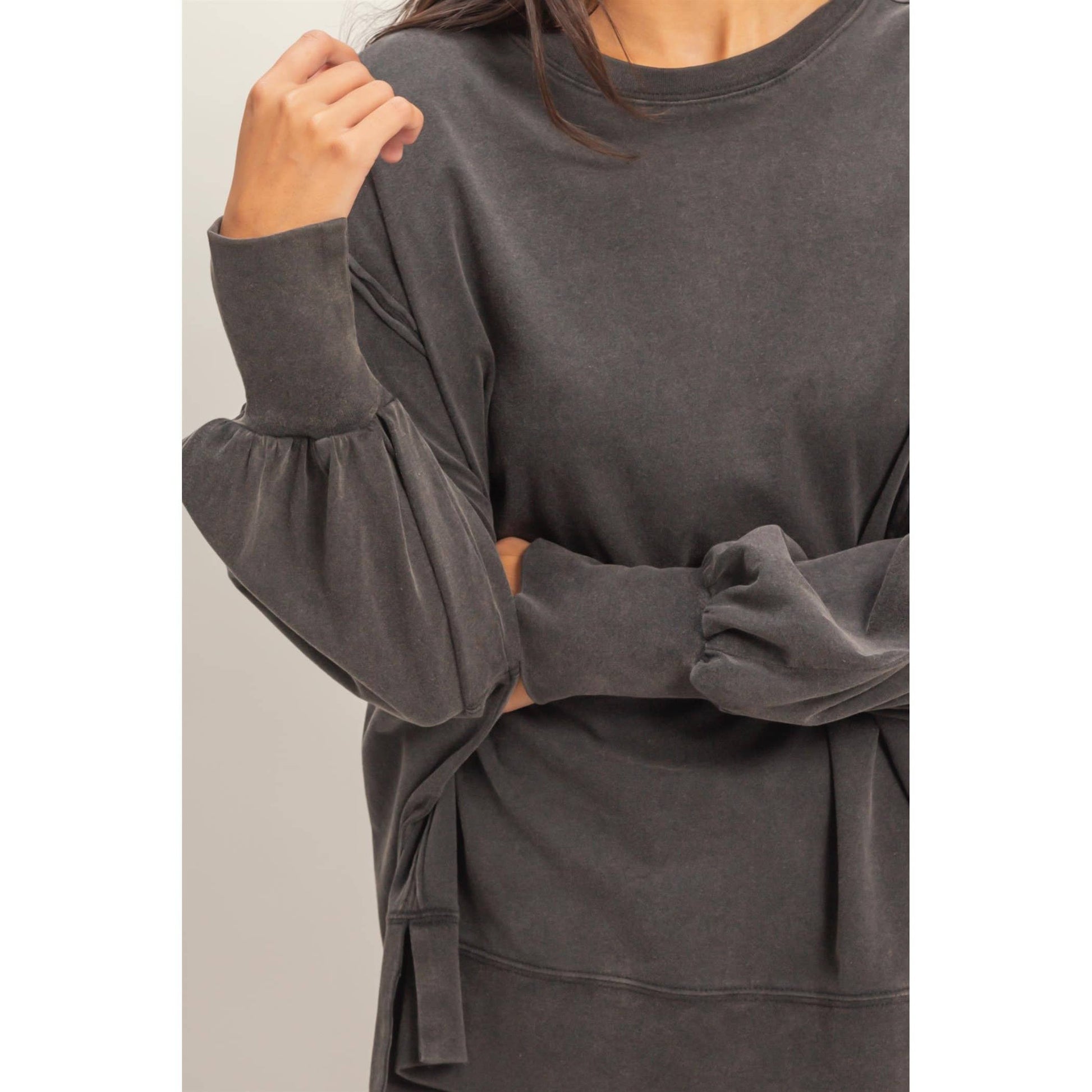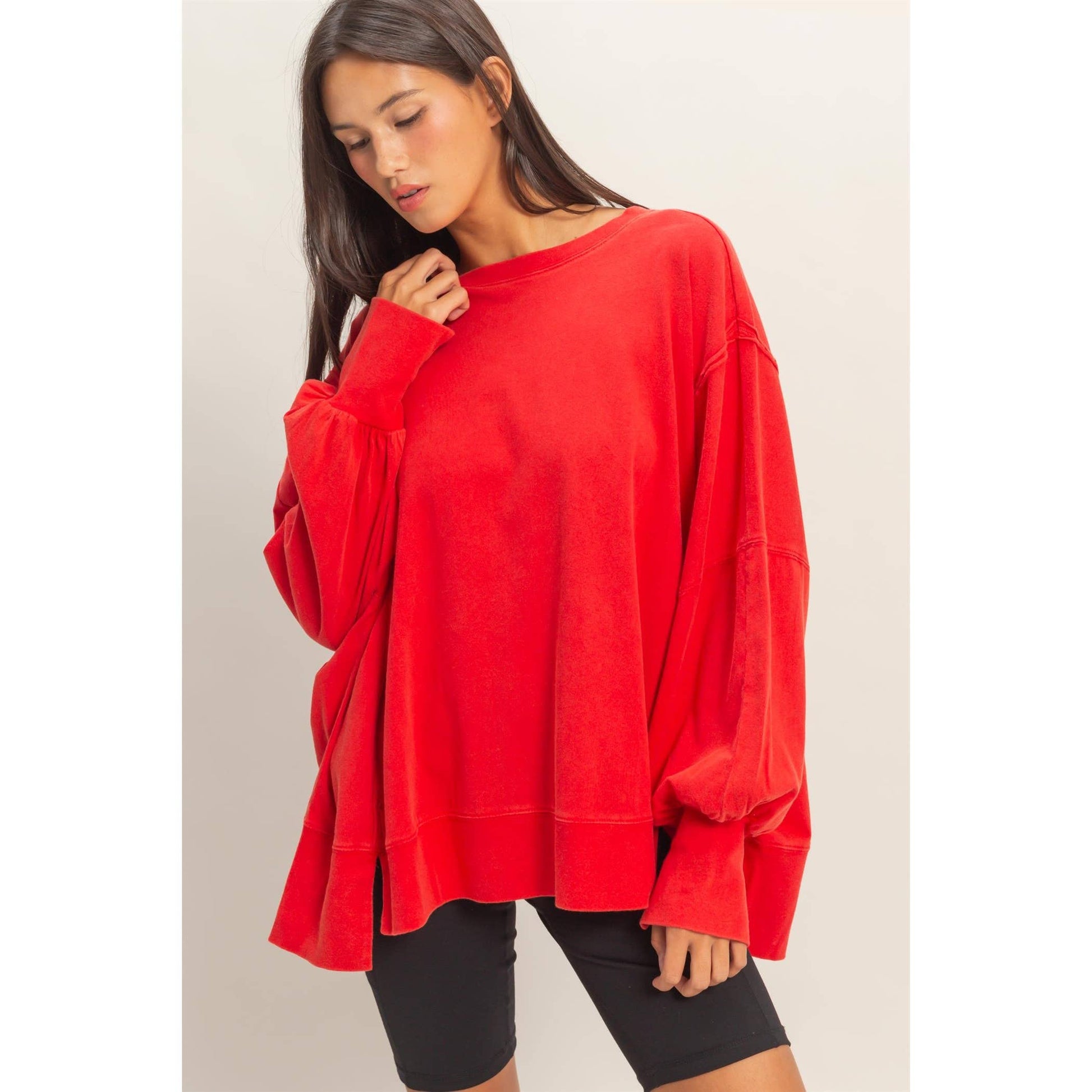 This sweatshirt is crafted from soft cotton with a vintage wash finish. The design includes a classic crew neckline and long sleeves with exposed reverse seam detailing on the side panels. The cut is an oversized fit with side slits. Pair with leggings or distressed denim for a casual chic look. 100% Cotton Model Is 5' 7" Tall, 32" Chest, 23" Waist, 34" Hips And Wearing A Size Small Imported. Designed In The USA